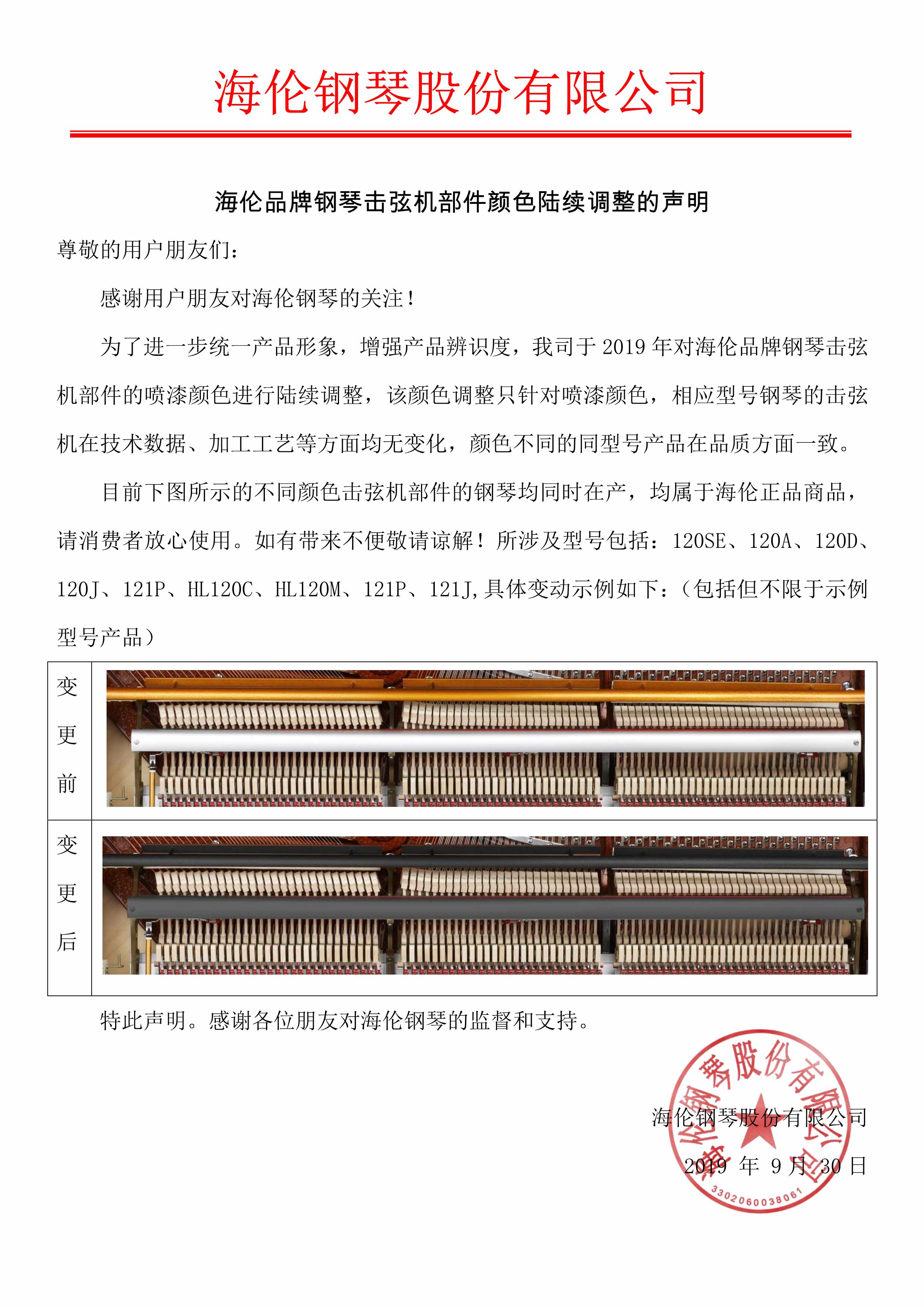 2019年海倫公司關于海倫鋼琴擊弦機配件顏色聲明