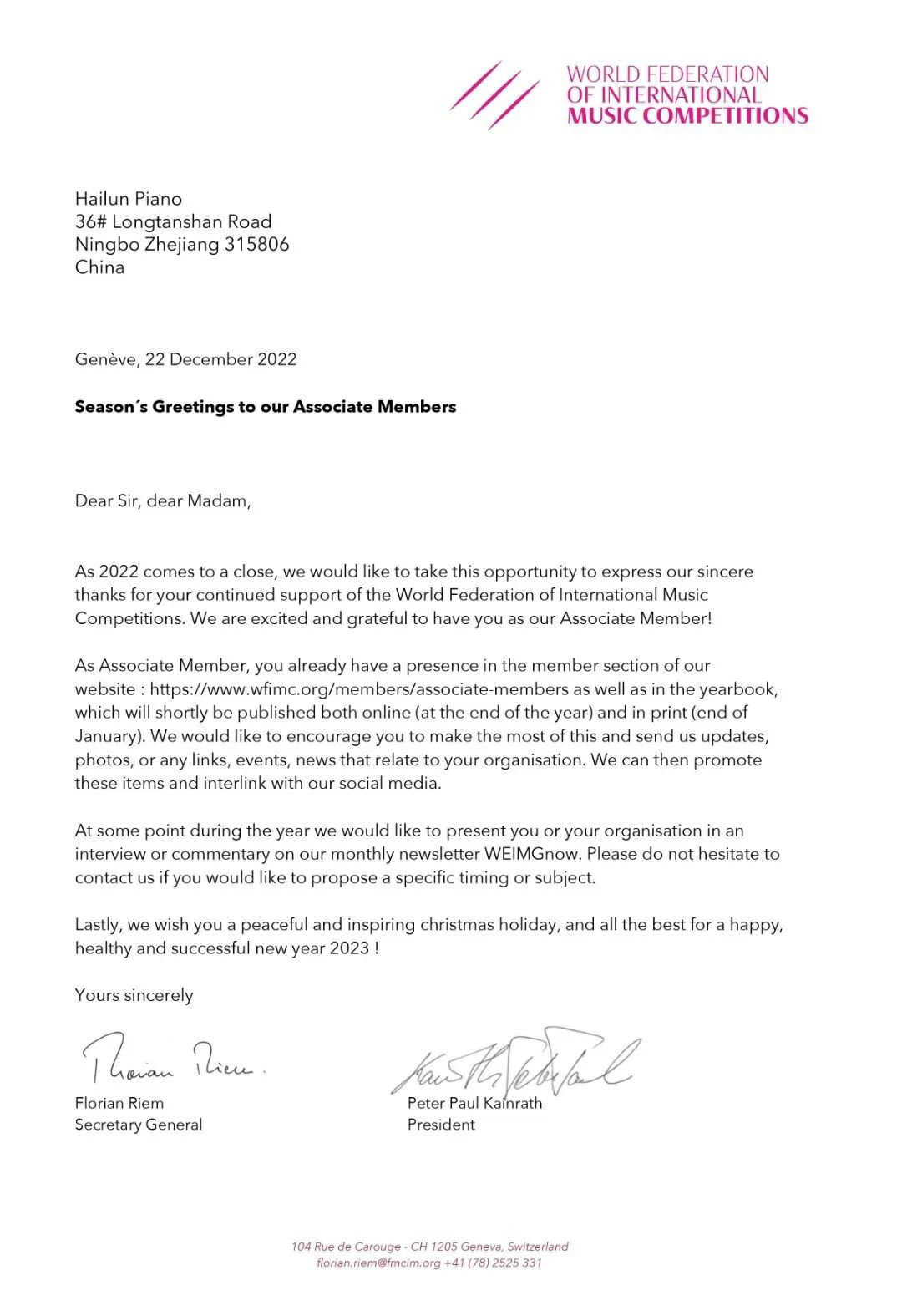 中國海倫鋼琴成為了大中華地區(qū)唯一樂器制造業(yè)成員,聯(lián)盟現(xiàn)任主席彼得保羅.凱涅夫先生與秘書長弗洛里安.里姆先生致信祝賀。