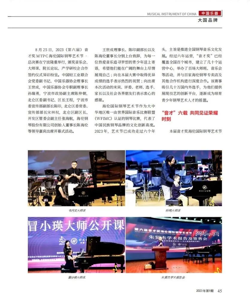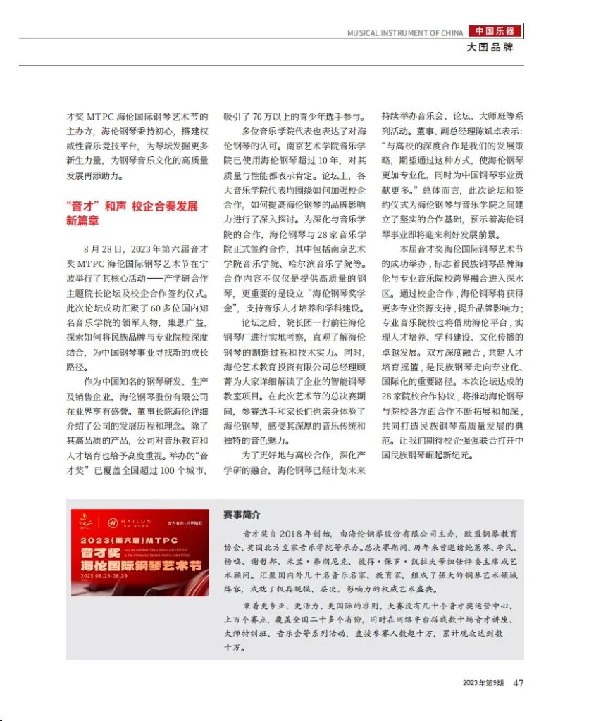 近日,“音才”賦能校企跨界融合,海倫加速布局高端市場——2023音才獎MTPC海倫國際鋼琴藝術節比賽登上了《中國樂器》2023年第9期(總第248期)大國品牌專欄。《中國樂器》雜志是由中國輕工業聯合會主管,中國樂器協會主辦的行業會刊,以權威的視角,見證著中國樂器行業的繁榮和發展過程中的每一個關鍵歷史事件。