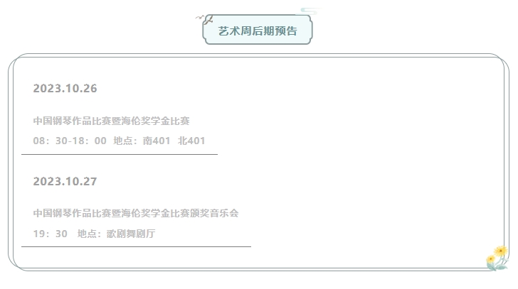 本次藝術(shù)周以弘揚(yáng)中國優(yōu)秀音樂作品為主題,為學(xué)生提供良好的學(xué)習(xí)、交流與合作的平臺,助力學(xué)生提高專業(yè)演奏水平,豐富舞臺表演經(jīng)驗(yàn)。藝術(shù)周包括講座、公開課、鋼琴作品音樂會、研討會及中國鋼琴作品海倫獎學(xué)金比賽和頒獎音樂會。