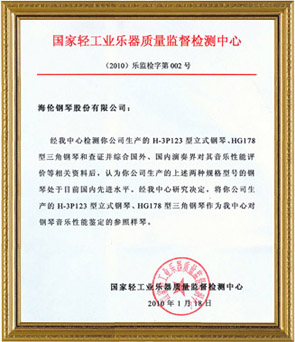 2010年1月18日,海倫鋼琴被國家輕工業樂器質量監督檢測中心確定為鋼琴音樂性能鑒定的參照樣琴。