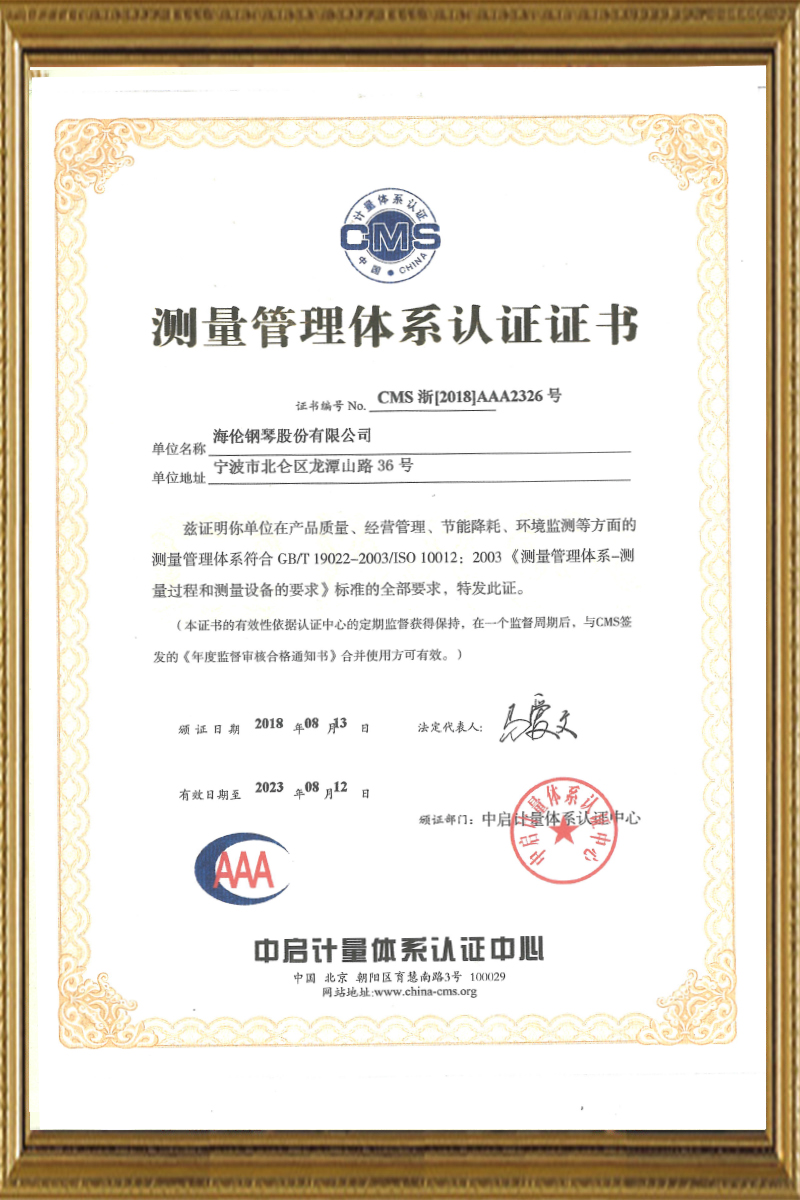 海倫鋼琴股份有限公司所生產的鋼琴和操作規范符合國家測量管理體系的規定。