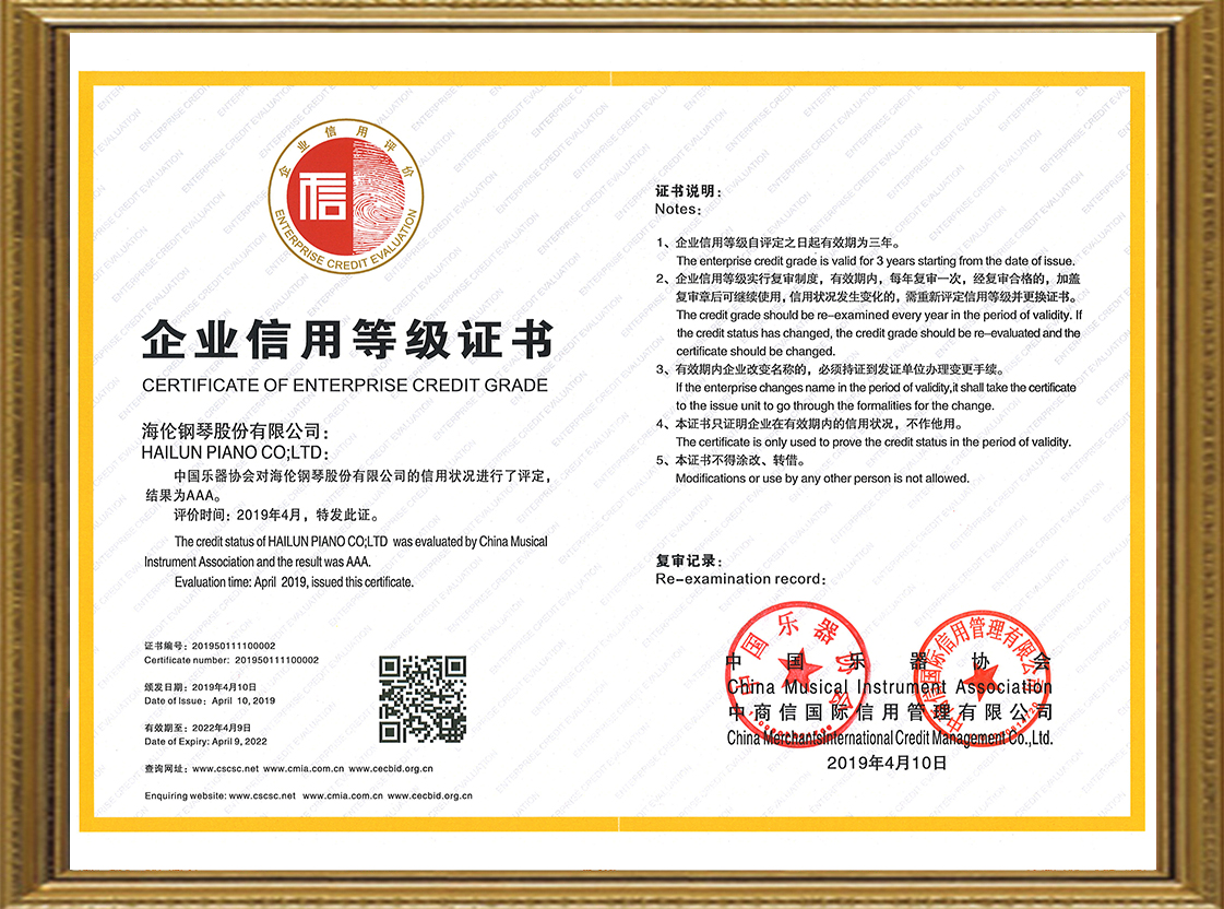 企業信用等級證書 中國樂器協會對海倫鋼琴股份有限公司的信用狀況進行了評定,顯示結果為AAA。