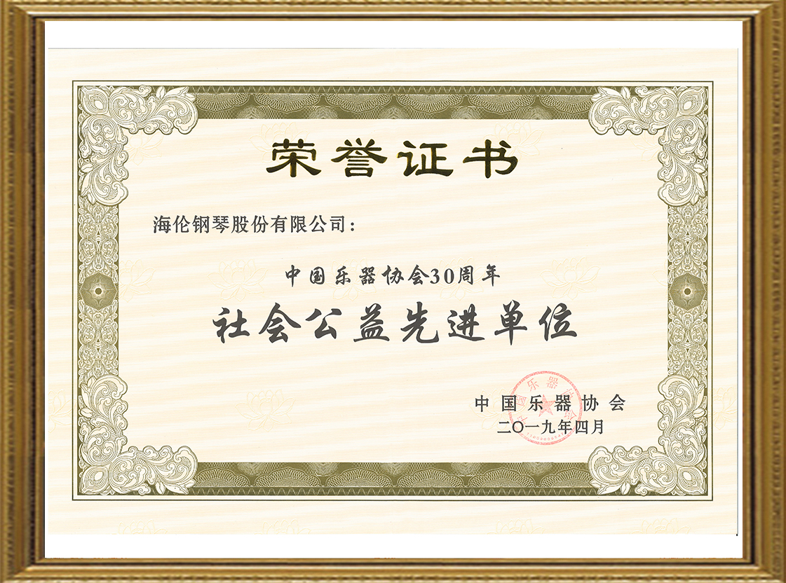 社會公益先進單位榮譽證書 中國樂器協會為海倫鋼琴股份有限公司頒發中國樂器協會30周年社會公益先進單位榮譽證書。