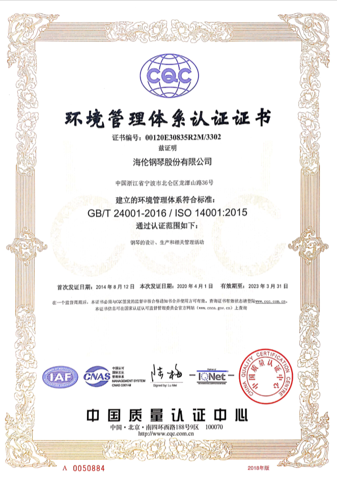 海倫鋼琴股份有限公司所生產的鋼琴和操作規范符合國家環境管理體系認證體系的規定。
